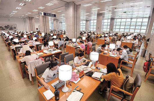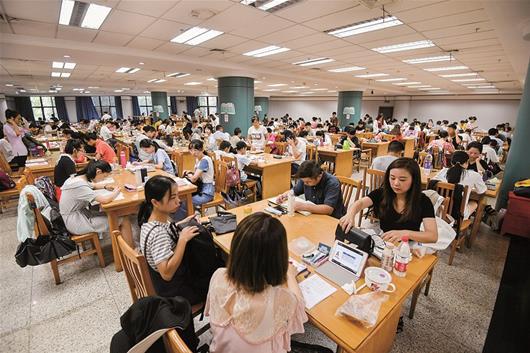 天氣炎熱,湖北省圖書館、武漢市圖書館內(nèi)閱讀納涼的讀者爆棚,兩家圖書館日均涌入1萬多人。左圖為昨日清晨,讀者早早地在武漢市圖書館外排隊等待開門。楚天都市報記者徐穎蕭顥攝影報道