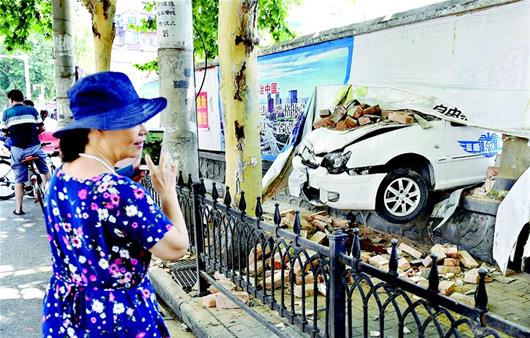 駕校位于江岸區(qū)匯通路和京漢大道交會(huì)處,撞破的院墻緊挨京漢大道的人行道。楚天都市報(bào)記者在現(xiàn)場看到,破洞面積約2平方米,車身印有“藍(lán)盾駕!弊謽拥慕叹氒嚻茡p車頭從洞口伸出,車輪懸空(如圖)。駕校方已在破洞兩側(cè)用鋼管等將人行道攔住,避免行人在墻下發(fā)生危險(xiǎn)。駕校人員在懸空的車輪下墊起磚頭,然后準(zhǔn)備用車將教練車從洞里拖出,但因車底盤被卡嘗試兩次都沒成功!拔耶(dāng)時(shí)踩了剎……”李先生說,他當(dāng)時(shí)正在進(jìn)行科目二練習(xí),不知怎的撞上了另外一臺(tái)車,然后他踩剎車車就沖向了院墻。