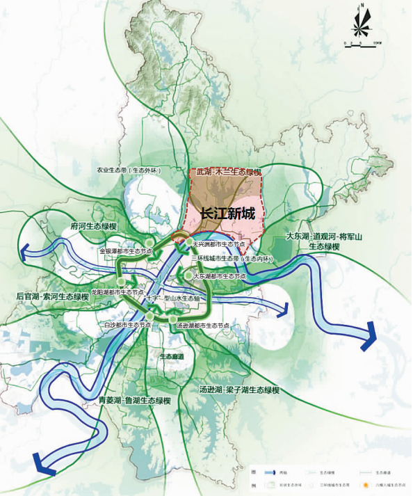 在生態(tài)格局上,更加彰顯“兩軸、兩環(huán)、六楔、多廊”的生態(tài)結(jié)構(gòu),實(shí)現(xiàn)“理水、融綠、營(yíng)城”。依托武湖、草湖核心水體構(gòu)建城市水庫(kù),實(shí)施上、下湖隔堤工程;構(gòu)建完善的河道河湖體生態(tài)系統(tǒng),打造融入景觀的生態(tài)雨水管理體系;營(yíng)造共生綠楔,實(shí)施大別山到木蘭山到長(zhǎng)江的山湖林田河的整體的涵養(yǎng)與保護(hù),構(gòu)筑十字生態(tài)軸、環(huán)城七彩森林帶、縱橫藍(lán)綠網(wǎng)、兩級(jí)通風(fēng)廊道;傳承山水文脈,融匯未來(lái)模式,形成科學(xué)研發(fā)、共享創(chuàng)新、商務(wù)服務(wù)、國(guó)際經(jīng)濟(jì)、港口自貿(mào)、生態(tài)示范等發(fā)展片區(qū)。