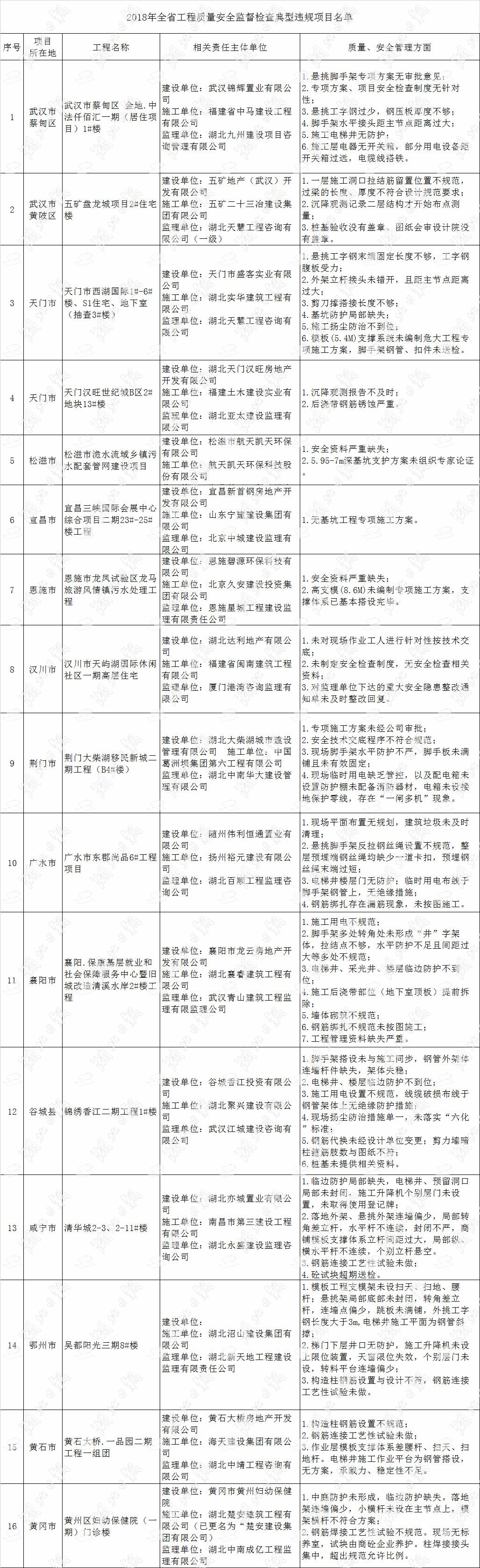 湖北日報訊 (記者彭一葦、通訊員劉姝、魯勇)7月25日,省住建廳通報了2018年全省工程質量安全監(jiān)督檢查情況,此次共抽查房建工程、鄉(xiāng)鎮(zhèn)生活污水處理工程、易地扶貧搬遷安置工程等92項在建工程,針對發(fā)現的突出問題,督查組直接下達執(zhí)法建議書10份、責令限期改正通知書11份。