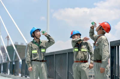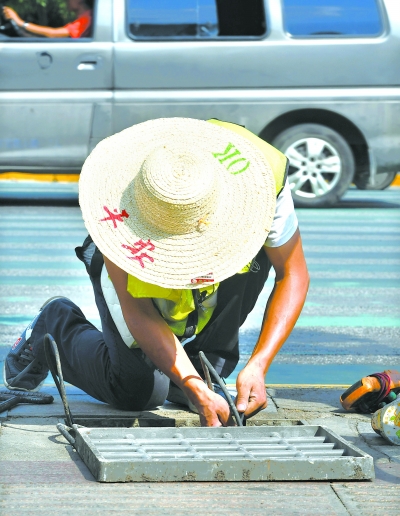 因條件限制,工人頂著烈日在月湖橋施工,橋上沒有一處遮陰位置