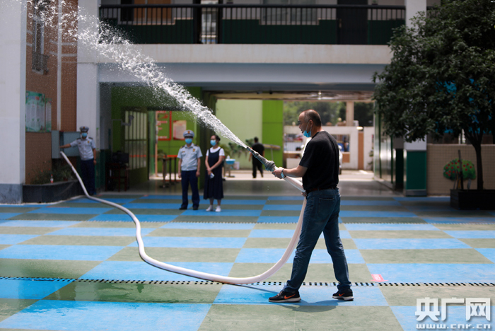 圖為:2020年8月28日,在湖北省武漢市漢陽區(qū)楚才小學(xué),一名工作人員正在演示利用校內(nèi)消防設(shè)施快速滅火。(央廣網(wǎng)發(fā) 通訊員王方攝)