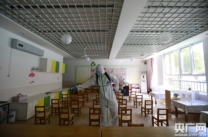 圖為:2020年8月28日,在湖北省武漢市華中師范大學(xué)附屬鐵橋幼兒園內(nèi),消防員正在對班級教室進(jìn)行全面消殺。(央廣網(wǎng)發(fā) 通訊員王方攝)