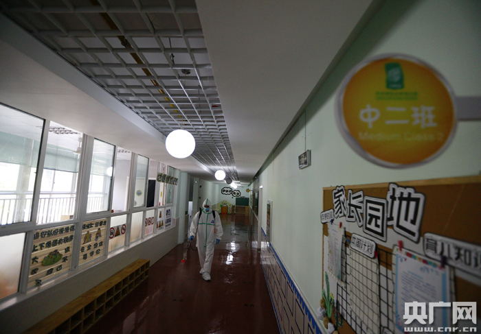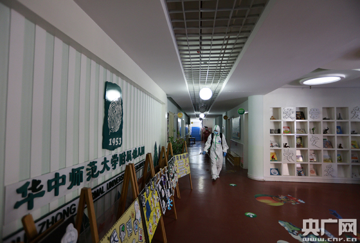 圖為:2020年8月28日,在湖北省武漢市華中師范大學(xué)附屬鐵橋幼兒園內(nèi),消防員正在對走廊區(qū)域進(jìn)行全面消殺。(央廣網(wǎng)發(fā) 通訊員王方攝)
