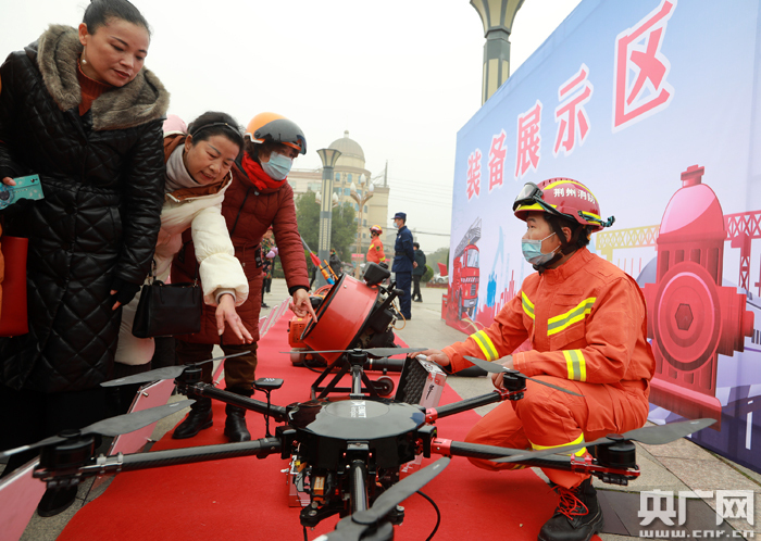 圖為:12月10日,在湖北省荊州市監(jiān)利市玉沙廣場(chǎng),市民們正參觀消防器材裝備。央廣網(wǎng)發(fā) 通訊員王方 攝