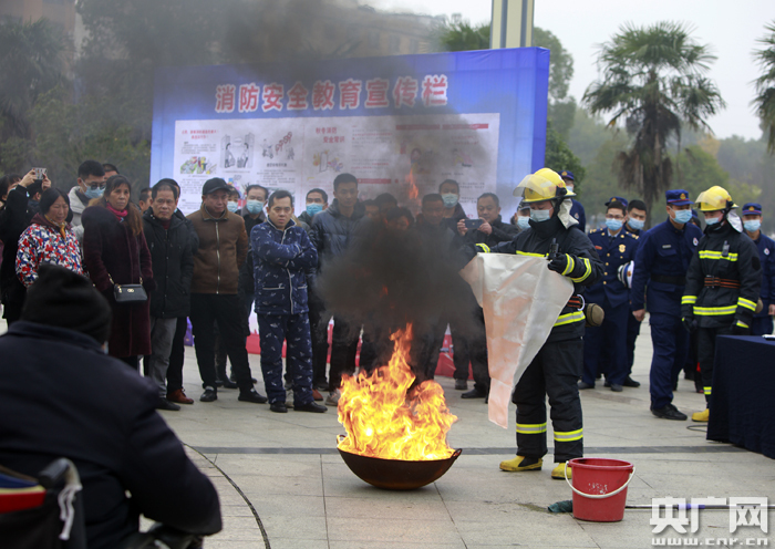 圖為:12月10日,在湖北省荊州市監(jiān)利市玉沙廣場(chǎng),消防員正向市民們演示油鍋起火后的正確處置方法。央廣網(wǎng)發(fā) 通訊員王方 攝