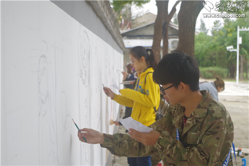 志愿者對(duì)著底稿在墻上勾畫。楊瀟 攝