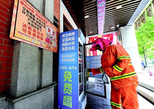 “戶外勞動者,天熱辛苦了”“冰柜有冷飲,可免費領(lǐng)取”……