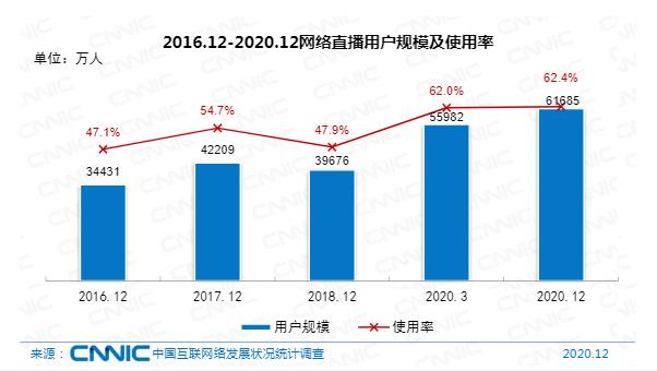 截至2020年12月,我國(guó)網(wǎng)絡(luò)直播用戶(hù)規(guī)模達(dá)6.17億,較2020年3月增長(zhǎng)5703萬(wàn),占網(wǎng)民整體的62.4%。其中,電商直播用戶(hù)規(guī)模為3.88億,較2020年3月增長(zhǎng)1.23億,占網(wǎng)民整體的39.2%。此外,真人秀直播和演唱會(huì)直播用戶(hù)數(shù)較2020年3月均有所增長(zhǎng),占比分別為24.2%和19.2%;游戲直播和體育直播用戶(hù)數(shù)較2020年3月均減少,占比分別為19.3%和13.9%。
