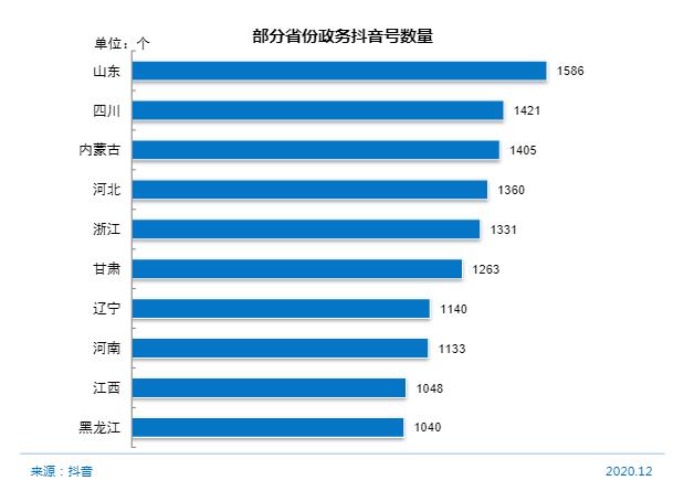 河南省各級(jí)政府共開(kāi)通政務(wù)機(jī)構(gòu)微博10130個(gè),居全國(guó)首位。開(kāi)通政務(wù)頭條號(hào)最多的省份為山東省,共開(kāi)通7874個(gè);共10個(gè)省份開(kāi)通的政務(wù)頭條號(hào)超過(guò)3000個(gè)。同時(shí),山東也是開(kāi)通政務(wù)抖音號(hào)數(shù)量最多的省份,共開(kāi)通1586個(gè)。