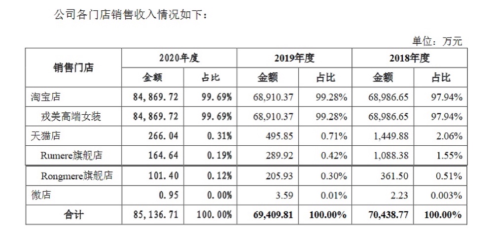 據(jù)戎美股份招股說(shuō)明書(shū),戎美股份成立于2012年3月13日,是一家線(xiàn)上服飾品牌零售公司,基于互聯(lián)網(wǎng)平臺(tái),依托“戎美RUMERE”品牌,公司經(jīng)營(yíng)服裝的企劃設(shè)計(jì)、供應(yīng)鏈管理和銷(xiāo)售業(yè)務(wù),主要產(chǎn)品包括職業(yè)與休閑風(fēng)格的女裝及男裝和配飾等,旗下有淘寶金冠店和天貓店等多個(gè)銷(xiāo)售平臺(tái)。其中,戎美股份99%以上的銷(xiāo)售額來(lái)自淘寶店鋪“戎美高端女裝”。