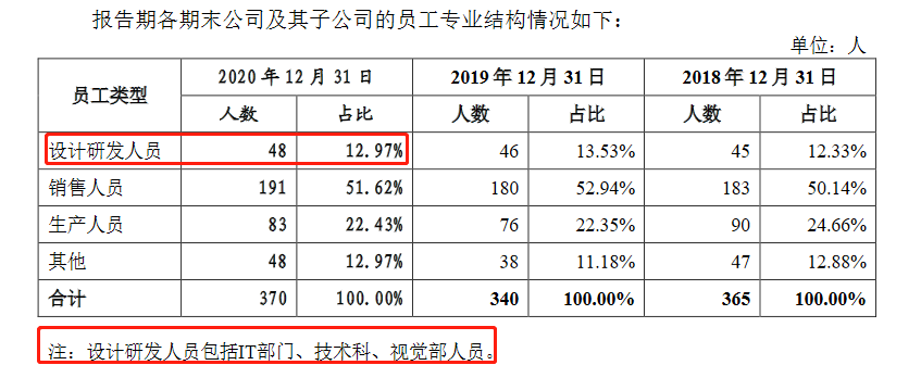 招股說(shuō)明書(shū)顯示,戎美股份2020年間研發(fā)投入占其營(yíng)業(yè)收入的比例僅為1.42%。從研發(fā)人員的數(shù)量上來(lái)看,2020年,戎美股份的設(shè)計(jì)研發(fā)人員有48人,占其員工人數(shù)的比例為12.97%,值得注意的是,這48人中還包含了IT部門(mén)、技術(shù)科、視覺(jué)部人員。