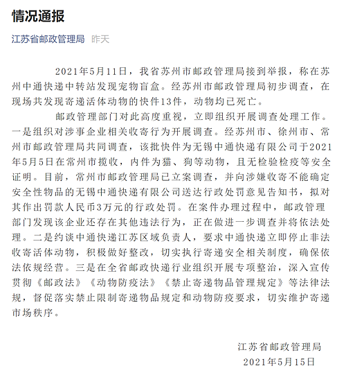 郵政管理部門對此高度重視,立即組織開展調(diào)查處理工作。一是組織對涉事企業(yè)相關(guān)收寄行為開展調(diào)查。經(jīng)蘇州市、徐州市、常州市郵政管理局共同調(diào)查,該批快件為無錫中通快遞有限公司于2021年5月5日在常州市攬收,內(nèi)件為貓、狗等動物,且無檢驗檢疫等安全證明。目前,常州市郵政管理局已立案調(diào)查,并向涉嫌收寄不能確定安全性物品的無錫中通快遞有限公司送達行政處罰意見告知書,擬對其作出罰款人民幣3萬元的行政處罰。在案件辦理過程中,郵政管理部門發(fā)現(xiàn)該企業(yè)還存在其他違法行為,正在做進一步調(diào)查并將依法處理。二是約談中通快遞江蘇區(qū)域負責人,要求中通快遞立即停止非法收寄活體動物,積極做好整改,切實執(zhí)行寄遞安全相關(guān)制度,確保依法依規(guī)經(jīng)營。三是在全省郵政快遞行業(yè)組織開展專項整治,深入宣傳貫徹《郵政法》《動物防疫法》《禁止寄遞物品管理規(guī)定》等法律法規(guī),督促落實禁止限制寄遞物品規(guī)定和動物防疫要求,切實維護寄遞市場秩序。