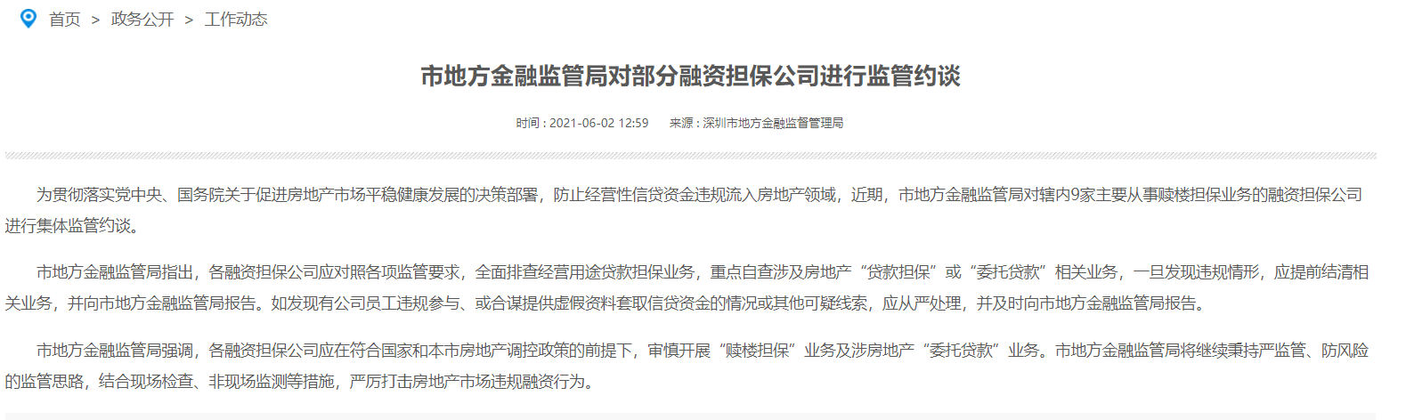 央廣網(wǎng)北京6月2日消息(記者 楊崇)2日,深圳市地方金融監(jiān)管局發(fā)布公告稱,近期對(duì)轄內(nèi)9家主要從事贖樓擔(dān)保業(yè)務(wù)的融資擔(dān)保公司進(jìn)行了集體監(jiān)管約談。