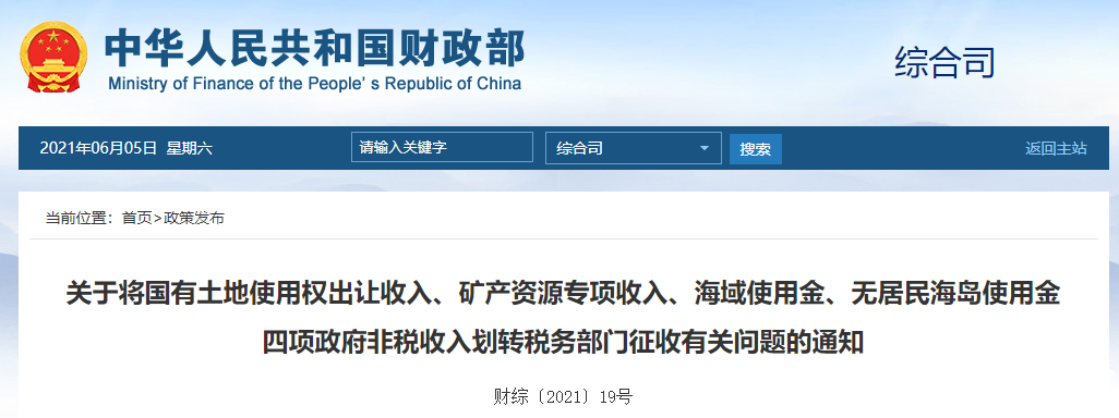 央廣網(wǎng)北京6月5日消息(記者 牛谷月)記者從財(cái)政部官網(wǎng)獲悉,6月5日,財(cái)政部、自然資源部、稅務(wù)總局、人民銀行四部門(mén)聯(lián)合發(fā)布《關(guān)于將國(guó)有土地使用權(quán)出讓收入、礦產(chǎn)資源專項(xiàng)收入、海域使用金、無(wú)居民海島使用金四項(xiàng)政府非稅收入劃轉(zhuǎn)稅務(wù)部門(mén)征收有關(guān)問(wèn)題的通知》(以下簡(jiǎn)稱《通知》)!锻ㄖ分赋,為貫徹落實(shí)黨中央、國(guó)務(wù)院關(guān)于政府非稅收入征管職責(zé)劃轉(zhuǎn)稅務(wù)部門(mén)的有關(guān)部署和要求,決定將國(guó)有土地使用權(quán)出讓收入、礦產(chǎn)資源專項(xiàng)收入、海域使用金、無(wú)居民海島使用金四項(xiàng)政府非稅收入統(tǒng)一劃轉(zhuǎn)稅務(wù)部門(mén)征收。