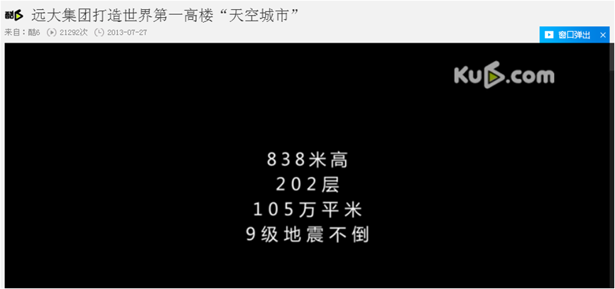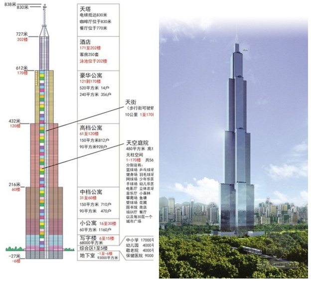 這部宣傳片列舉了一長串驚人數(shù)字:“天空城市”將建造838米,地上202層,地下6層,共計208層,超越迪拜哈里發(fā)塔(828米)成為世界第一高樓。項目凈占地30畝,建筑面積105萬平方米,9級地震不倒。