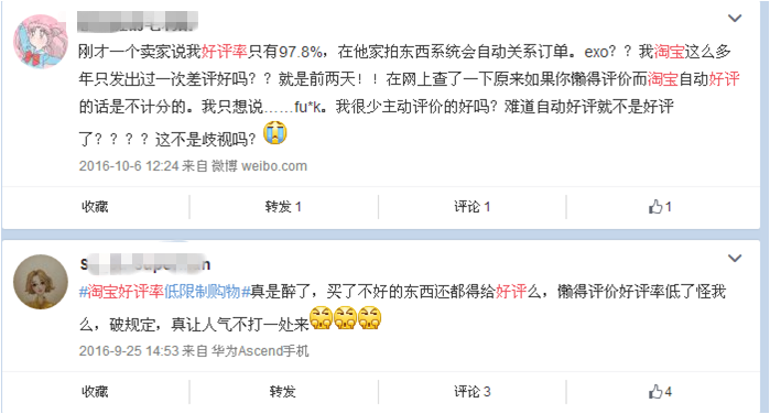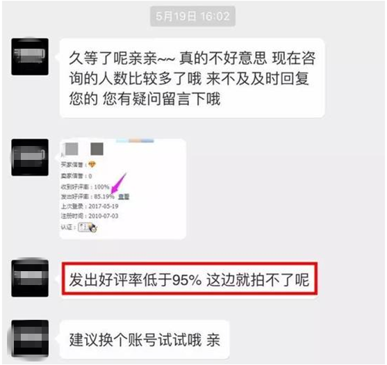 周小姐介紹,“她下單的時(shí)候,交易直接是關(guān)閉狀態(tài),直接沒(méi)法付款,下不了單。這是什么原因?客服明確跟她說(shuō),‘這是因?yàn)槟愫迷u(píng)率低于95%,所以不給下單。’后來(lái)我們了解到,不少淘寶上做得比較大的店鋪,都有類似的做法。以前只是個(gè)例,最近集中爆發(fā)出來(lái)了!