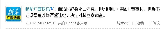 自治區(qū)紀委今日消息,柳州鋼鐵(集團)董事長、黨委書記梁景理涉嫌嚴重違紀,決定對其立案調(diào)查。