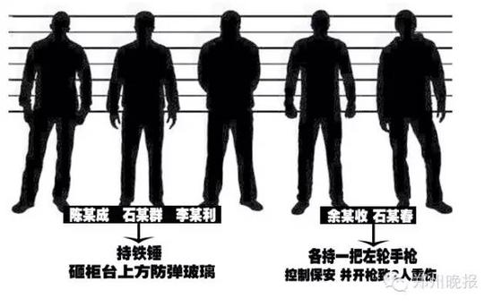 具體的分工是:余某收和石某春各持一把左輪手槍,負(fù)責(zé)控制值班的保安,并開了槍。石某群回憶,李某利和陳某成負(fù)責(zé)砸防彈玻璃,各砸了一個(gè)洞口,他接著砸,不到一分鐘玻璃砸開了,他們迅速鉆進(jìn)入營業(yè)室用編織袋搶錢。