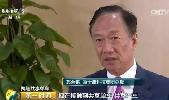 富士康科技集團(tuán)總裁 郭臺(tái)銘: 就是現(xiàn)在接觸到共享單車、共享汽車,進(jìn)入到這些很多的網(wǎng)絡(luò)的,等于說硬件和軟件要結(jié)合的時(shí)代,所以說富士康做到這個(gè)就蠻重要的。我們?cè)谥圃斓念I(lǐng)域,在設(shè)計(jì)開發(fā)的領(lǐng)域,可以把這家公司很快地讓它有一個(gè)市場(chǎng)占有率。