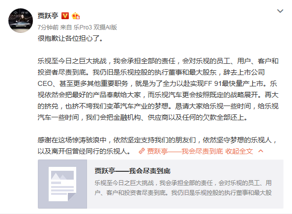賈躍亭在微博上表示:樂(lè)視至今日之巨大挑戰(zhàn),我會(huì)承擔(dān)全部的責(zé)任,會(huì)對(duì)樂(lè)視的員工、用戶、客戶和投資者盡責(zé)到底。我仍舊是樂(lè)視控股的執(zhí)行董事和最大股東,辭去上市公司CEO、甚至更多其他重要職務(wù),就是為了全力以赴實(shí)現(xiàn)FF 91最快量產(chǎn)上市。樂(lè)視依然會(huì)把最好的產(chǎn)品奉獻(xiàn)給大家,而樂(lè)視汽車更會(huì)按照既定的戰(zhàn)略展開(kāi)。再大的擠兌,也擠不垮我們變革汽車產(chǎn)業(yè)的夢(mèng)想。懇請(qǐng)大家給樂(lè)視一些時(shí)間,給樂(lè)視汽車一些時(shí)間,我們會(huì)把金融機(jī)構(gòu)、供應(yīng)商以及任何的欠款全部還上。