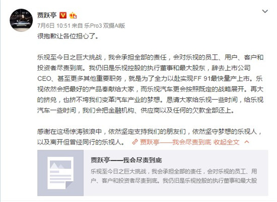 7月6日上午,樂(lè)視控股CEO、樂(lè)視網(wǎng)董事長(zhǎng)賈躍亭發(fā)布一封個(gè)人聲明,其在聲明中稱,"會(huì)對(duì)樂(lè)視的員工、用戶、客戶和投資者盡責(zé)到底。"而之所以辭去上市公司CEO,目的在于"全力以赴實(shí)現(xiàn)FF 91最快量產(chǎn)上市",同時(shí),"懇請(qǐng)大家給樂(lè)視一些時(shí)間,給樂(lè)視汽車一些時(shí)間,我們會(huì)把金融機(jī)構(gòu)、供應(yīng)商以及任何的欠款全部還上"。