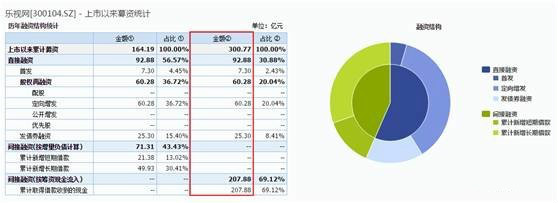 Wind資訊統(tǒng)計(jì)顯示,自2010年上市以來(lái)的近七年時(shí)間里,樂(lè)視網(wǎng)累計(jì)融資300.77億元,其中直接融資92.89億元,占總?cè)谫Y額30.88%;間接融資207.88億元,占總?cè)谫Y額69.12%。
