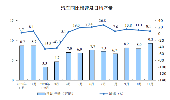 分三大門類看,11月份,采礦業(yè)增加值同比增長2.0%,增速較10月份放緩1.5個(gè)百分點(diǎn);制造業(yè)增長7.7%,加快0.2個(gè)百分點(diǎn);電力、熱力、燃?xì)饧八a(chǎn)和供應(yīng)業(yè)增長5.4%,加快1.4個(gè)百分點(diǎn)。