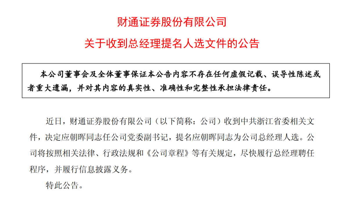 - 在代履職11個(gè)月后,財(cái)通證券新一任總經(jīng)理應(yīng)朝暉即將走馬上任。