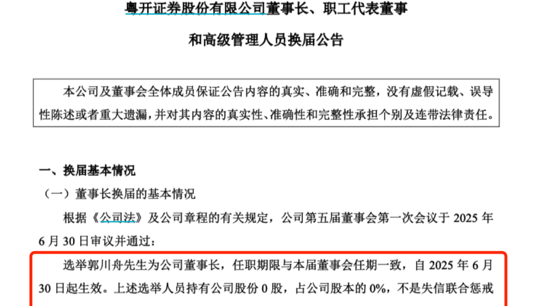 郭川舟被選舉為粵開證券董事長,其同時擔(dān)任粵開證券控股股東廣開控股的董事長。
