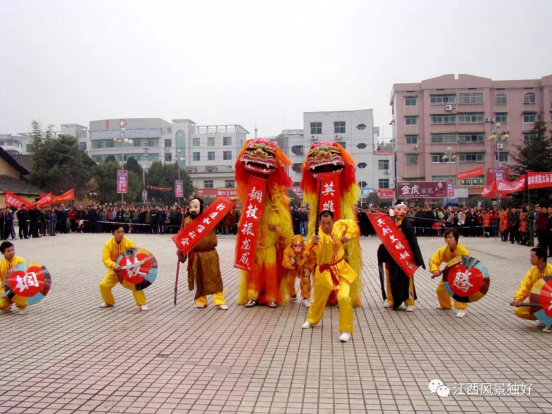 客家燈彩——活靈活現(xiàn)。銅鼓客家獅、太平燈、漁樵耕讀、七鯉搶蝦等燈彩都是群眾喜聞樂(lè)見(jiàn)的歡慶活動(dòng),均入選了省級(jí)非物質(zhì)文化遺產(chǎn)保護(hù)名錄。其中,銅鼓客家獅將獅由“怪獸”化為“神獸”,并通過(guò)舞蹈、武術(shù)、雜技、戲劇等多樣性表演來(lái)表達(dá)新春祝福。銅鼓客家獅一般從每年農(nóng)歷初一始在祠堂內(nèi)請(qǐng)神、拜獅、起蘸,正月十五勾燈結(jié)束。其間,每到一村先尋一開闊地表演孫悟空、豬八戒、沙和尚降獅(三僧伴舞風(fēng)趣幽默,獅有熊獅、眼獅、悶獅等動(dòng)作);另有疊花架,十八般武藝對(duì)練,雜技表演等,全套表演人數(shù)十四人,時(shí)間約二小時(shí)左右。表演結(jié)束后由悟空引獅至各家送福送喜。