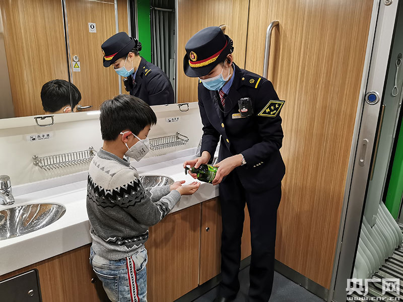 南昌客運(yùn)段由南昌開往北京西的D738次列車上,列車長(zhǎng)劉雅夢(mèng)悉心的向小旅客介紹洗手步驟,為有需要的旅客提供口罩并介紹正確的戴法。
