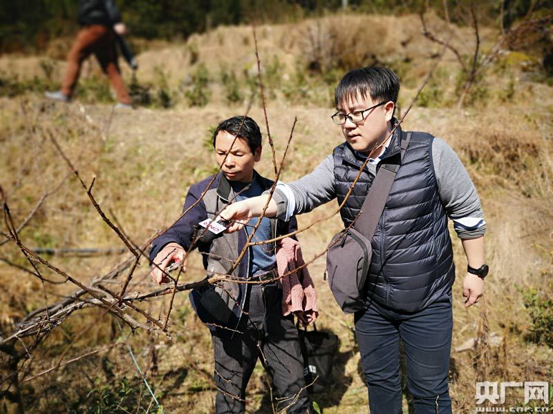 駱德濱向記者介紹自家的黃桃林(央廣網(wǎng)發(fā) 謝元森攝)
