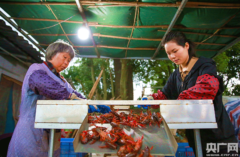 江西省吉安市吉水縣醪橋鎮(zhèn)元石村稻蝦共作基地,村民正在分揀小龍蝦