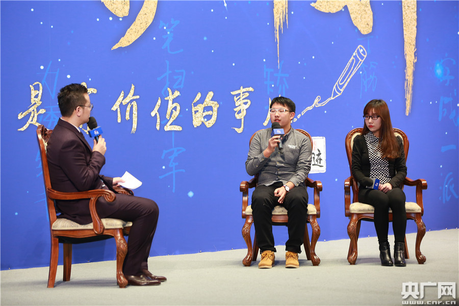 央廣網(wǎng)北京1月12日消息 昨日(11日),由方正手跡發(fā)起的“字體手護(hù)計(jì)劃”首屆年度分享交流會(huì)在北京大學(xué)舉行。教育部語言文字信息管理司司長田立新、著名書法家葉培貴、中央人民廣播電臺(tái)央廣網(wǎng)副總編輯伍剛、方正集團(tuán)副總裁劉建應(yīng)邀出席,與現(xiàn)場大學(xué)生代表一起分享了有關(guān)漢字文化傳承的新形勢、新方法。圖為“字體手護(hù)大使”王少雄、王霖分享自己的手下故事。