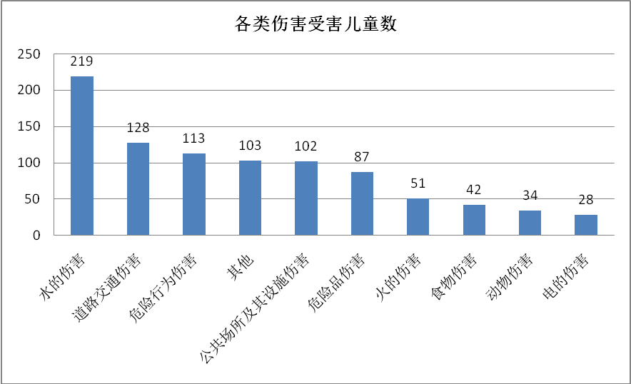 據(jù)告統(tǒng)計(jì),兒童傷害總?cè)藬?shù)為907人,其中死亡485人,占總數(shù)的53.5%。其中水的傷害、道路交通傷害、危險(xiǎn)行為傷害是造成兒童死亡人數(shù)最多的3類(lèi)傷害,死亡人數(shù)占該類(lèi)傷害受害人數(shù)比例分別達(dá)到75.8%、57.8%、55.8%。