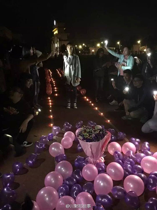 這不是求婚!4月6日晚,四川電影電視學院操場上@川影2015級編導六班的同學們給美女輔導員過生日,全班男生單膝跪地唱《小幸運》。