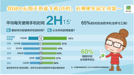 著名雕塑家羅丹曾說“世界上并不缺少美,而是缺少發(fā)現(xiàn)美的眼睛”,可放在當今中小學(xué)生群體中,缺少的卻是一副近視眼鏡。阿凡題《學(xué)習(xí)行為報告》顯示,我國00后近視眼率高達60%,居全球第一。而他們平均每天使用手機時間長達2小時15分鐘,其中平均刷視頻37分鐘、網(wǎng)上聊天32分鐘、打游戲28分鐘、上網(wǎng)拍照搜題15分鐘,聽音樂和看新聞則分別占用14分鐘和9分鐘。但調(diào)研顯示,使用時間長短并不與00后的使用需求直接相關(guān)。如雖然平均每天只花15分鐘進行拍照搜題搞定作業(yè),卻有65%的00后都會選擇把手機當作學(xué)習(xí)工具,換言之,學(xué)習(xí)已成為00后使用手機最主要的需求。