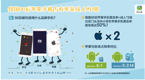 阿凡題報告指出,在擁有手機的00后當中,小米、華為、蘋果順利躋身他們最常使用手機品牌TOP3。更值得注意的是,對比蘋果與安卓手機的出貨量情況,我國00后蘋果手機的普及率已是成人的2倍,在北京門頭溝地區(qū)中小學(xué)生蘋果手機普及率甚至高達50%!