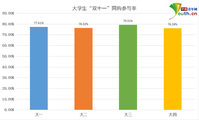 根據(jù)中國青年網(wǎng)調(diào)查數(shù)據(jù),530名受訪學(xué)生中,有410名學(xué)生參與“雙十一”網(wǎng)購,占受訪總?cè)藬?shù)的77.36%;158名受訪男生中,78.48%參與了網(wǎng)購,372名受訪女生中,76.88%參與了網(wǎng)購;大一至大四學(xué)生參與網(wǎng)購比例分別為77.41%、76.32%、79.31%和76.19%。