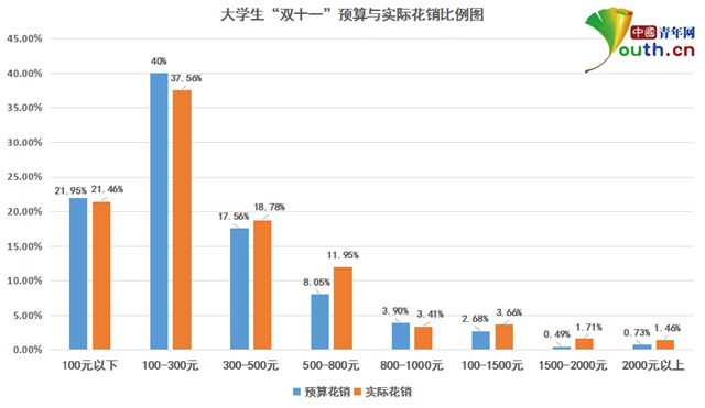 根據(jù)中國青年網(wǎng)調(diào)查結(jié)果顯示,40%的大學(xué)生網(wǎng)購預(yù)算為100-300元,其次為100以下、300-500元,分別占21.95%、17.56%。在實(shí)際花費(fèi)中,37.56%的網(wǎng)購大學(xué)生實(shí)際消費(fèi)為100-300元;其次為100元以下、300-500元,各占21.46%和18.78%。71.46%的大學(xué)生認(rèn)為自己“雙十一”網(wǎng)購實(shí)際消費(fèi)沒有超出預(yù)算,同時(shí)也有近3成大學(xué)生的網(wǎng)購消費(fèi)額度超出預(yù)算,變“剁手族”。