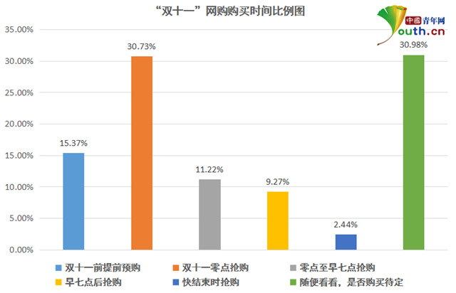 根據(jù)中國青年網(wǎng)調(diào)查數(shù)據(jù)顯示,在網(wǎng)購時(shí)間上,30.73%的學(xué)生選擇“雙十一”零點(diǎn)搶購,其次為提前預(yù)購和零點(diǎn)至早七點(diǎn)搶購,分別占15.37%、11.22%。另外,有30.98%的學(xué)生選擇隨便看看,是否購買待定。這說明,多數(shù)大學(xué)生決定在“雙十一”期間進(jìn)行搶購,消費(fèi)動(dòng)機(jī)明確。