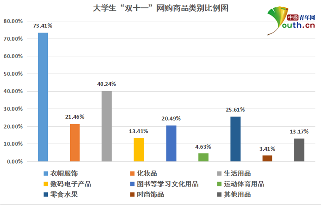 圖為大學(xué)生“雙十一”網(wǎng)購商品類別比例。中國青年網(wǎng)實(shí)習(xí)記者 李華錫 制圖