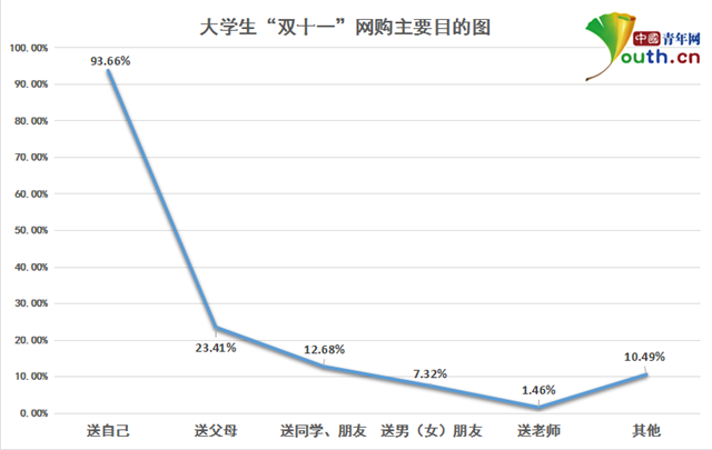 根據(jù)中國青年網(wǎng)調(diào)查,大學(xué)生網(wǎng)購目的多元化,93.66%的網(wǎng)購大學(xué)生是為自己進(jìn)行網(wǎng)購,其次是為送父母和送同學(xué)朋友,各占23.41%、12.68%。