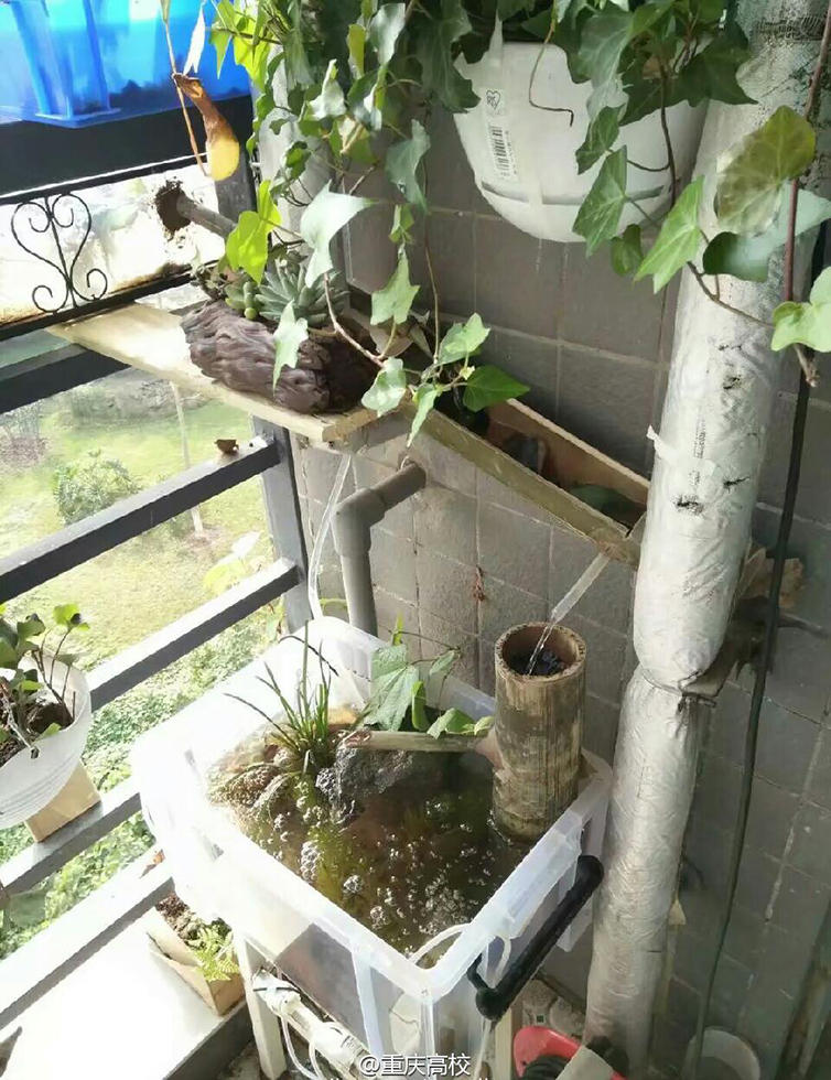 據(jù)網(wǎng)友爆料,重慶電子工程職業(yè)學(xué)院的一名同學(xué)在宿舍搞起了水產(chǎn)工程,整個陽臺擺滿了綠植、水草、玻璃缸,還有兩只烏龜,陽臺一秒變花園,網(wǎng)友感嘆:這是要構(gòu)建一個小型生態(tài)系統(tǒng)啊!