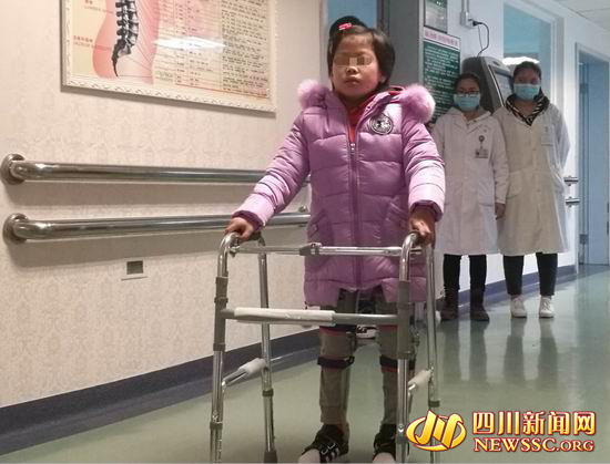 今日上午10點,在成都溫江一家醫(yī)院的過道上,琴琴(化名)在不用醫(yī)生幫助地情況下,自己帶上護(hù)具練習(xí)走路。雷倩告訴四川新聞網(wǎng)記者,琴琴到醫(yī)院后,因為身上多處有嚴(yán)重褥瘡,皮膚潰爛,因此每隔一個小時都需要翻一次身。