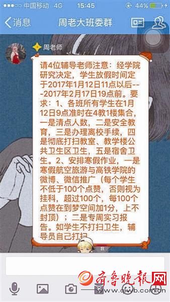 北京青年報1月12日消息,昨日,有網(wǎng)友爆料,四川的一所高校給學生布置一項“特殊”的寒假作業(yè),作業(yè)的內(nèi)容是要求學生在寒假推廣該校的官方公眾號,并且要求有“點贊”,對于“點贊”數(shù)量還有特定的要求。