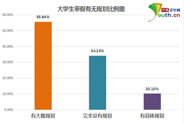 根據(jù)中國(guó)青年網(wǎng)記者調(diào)查顯示,對(duì)寒假生活有具體規(guī)劃和有大概規(guī)劃的人數(shù)分別為56人、296人,占總?cè)藬?shù)的的10.18%和55.64%;完全沒(méi)有規(guī)劃的人數(shù)為188人,占調(diào)查人數(shù)的34.18%。