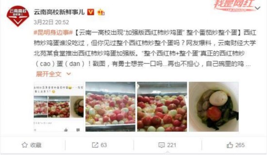 22日晚,微博用戶“云南高校新鮮事兒”發(fā)布了一條博文稱“網(wǎng)友爆料,云南財經(jīng)大學(xué)北苑某食堂推出西紅柿炒雞蛋加強(qiáng)版,整個西紅柿+整個蛋”,引得微博用戶紛紛轉(zhuǎn)發(fā)。云南財經(jīng)大學(xué)的學(xué)生們秒變“段子手”,紛紛在博文評論中吐槽、逗趣、認(rèn)校友.....。。