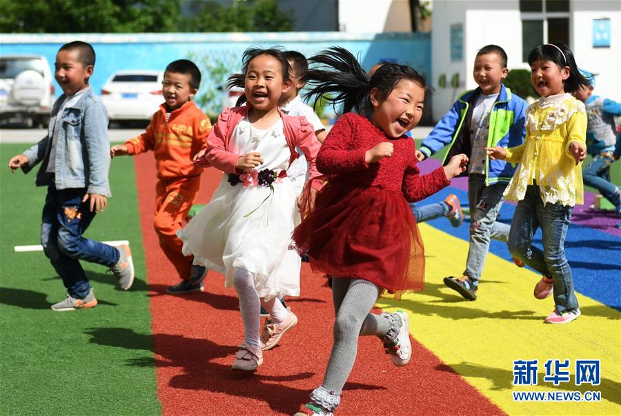 5月23日,甘肅省隴南市康縣長(zhǎng)壩鎮(zhèn)幼兒園的孩子在操場(chǎng)上奔跑玩耍。